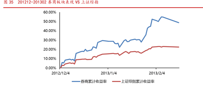 此轮行情上涨并不典型,推动力主要来自证券行业创新带来的行业阿尔法。2011 年 10 月底,郭树清就职证监会主席。2012 年上半年,加快改革、放松管制、鼓励创 新成为证券业乃至资本市场发展的主基调。2012 年 5 月的券商创新大会,出台《关 于推进证券公司改革开放、创新发展的思路与措施》。行业创新和监管放松推动了券 商两融和资管业务发展,同时净资本监管指标的完善为行业加杠杆创造了条件,行业 阿尔法触发券商上涨行情。