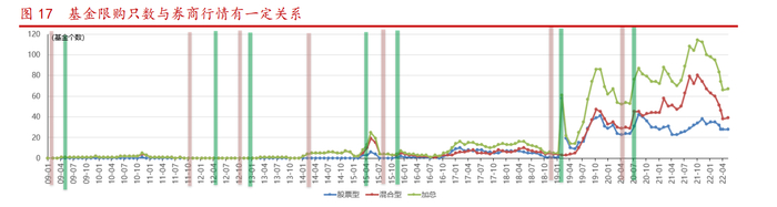 基金限购以及产业资本增持情况对券商行情判断有一定借鉴意义。基金限购只数 阶段性最低的时点往往也是券商行情的最低点,反之基金限购只数阶段性高点往往也 是券商行情的高点。产业资本增持的高点往往是券商行情的低点。