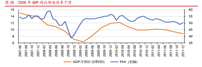 受国际金融危机的影响,外部需求明显收缩, 2008 年下半年经济增长下行的压 力明显加大。GDP 同比增速第一季度到第四季度逐季下滑,分别增长 10.6%、10.1%、 9%和 6.8%。为了应对危局,中国政府于 2008 年 11 月推出了进一步扩大内需、促进 经济平稳较快增长的十项措施。四万亿计划出台后,我国经济预期逐步修复。