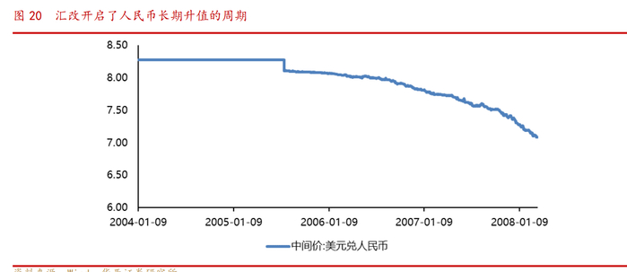 作为股权分置改革的配套措施,监管层不遗余力推动长期资金入市。包括社保基 金、保险资金入市, QFII 落地引入外资,以及公募基金行业大发展。 特别的是,2005 年 7 月,央行发布《关于完善人民币汇率形成机制改革的公 告》,我国开始实行以市场供需为基础,参考一篮子货币进行调校,有管理的浮动汇 率制度,此后开启了人民币长期升值的大周期。“汇改”所开启的人民币长期升值带 来的“热钱”对于行情的推动不可小觑,甚至作为聪明资金,我们判断外资可能是行 情启动的重要因素。
