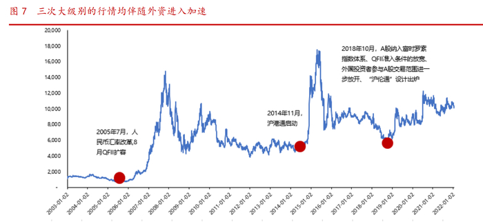 虽然整体上中国资本市场对外开放程度在不断加大,但可以发现,伴随每轮大的 行情的启动,中国资本市场对外开放均在阶段性加速。例如 06-07 年行情启动之时, 伴随着人民币汇率制度改革人民币升值,同时 QFII 扩容为大量境外资本涌入中国创 造了条件,成为推动权益市场在内的中国资产升值的重要力量;14-15 年券商行情爆 发时点恰为沪港通启动时点,全球资金有了直接投资 A 股的更便利途径,海外资金入 市预期增强;18 年底以来的行情背景是从 2018 年下半年开始资本市场加速对外开 放:A 股纳入富时罗素指数体系、QFII 准入条件的放宽、外国投资者参与 A 股交易范 围进一步放开、“沪伦通”制度设计出炉等增进了与全球市场互联互通,促进了境外 资本流入中国市场。
