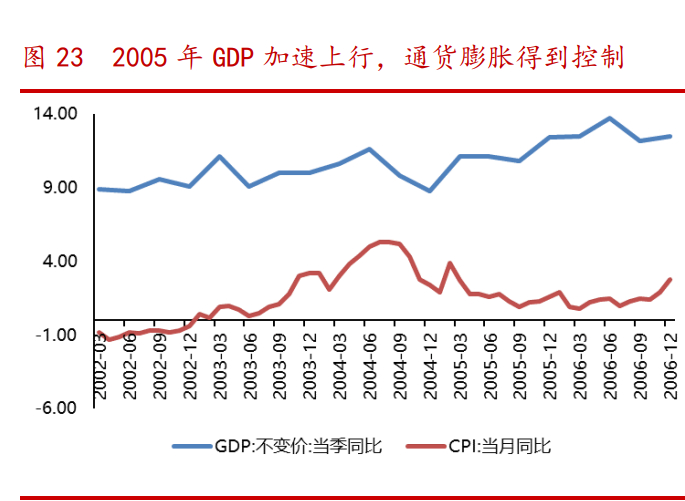 2005 年除了 GDP 增速进一步加速上行外,同时经济运行还有两个特点,一是固 定资产投资增速降温,2004 年的“经济过热”得到控制,另一方面,通货膨胀得到 了有效控制。2005 年 GDP 实际增速 11.4%,连续第四年加速上行,而 CPI 则基本运行 在 2%区间。