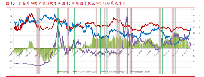 前文复盘说过,券商行情通常启动于美国与中国货币经济周期相一致的时候,在 较大级别的券商行情中,10 年期美债收益率上行而 10 年期中债收益率下行的组合仅 仅出现在 2005 年,而彼时人民币汇率放开人民币进入长期升值通道。 2021 年 9 月以来,中美 10 年期国债收益率利差不断收窄至倒挂,期间券商指数 波动下行。 美国一季度经济数据不及预期以及美国经济衰退风险影响了对美联储加息预期, 5 月份美债收益率回落明显。2022 年 5 月 7 日 10 年期美债收益率达到高点 3.12%, 此后逐渐下降至 5 月 27 日的 2.74%,近日略有反弹至 6 月 2 日的 2.92%。 整体我们认为美联储加息预期的最高点已过,这将有利于 A 股市场以及券商行情 的筑底,但 6 月份美联储缩表潜在风险仍需关注。