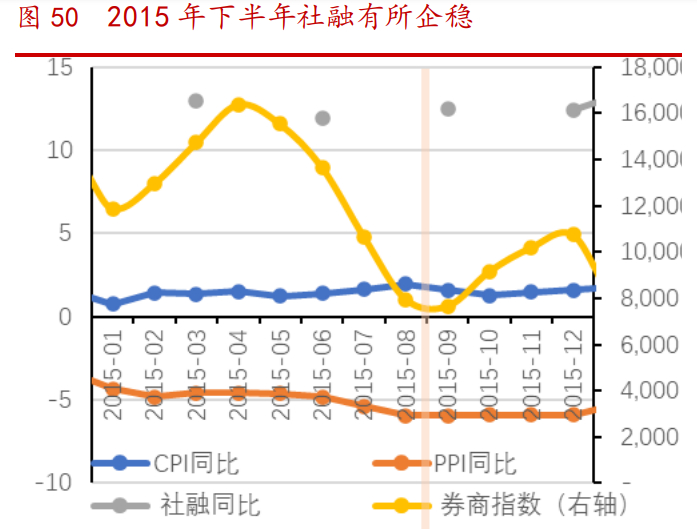 复盘历次券商行情,8 次行情均启动于宏观经济衰退后半段或复苏前半段,也就 是通胀下行、经济触底或企稳的过程中,这也符合美林投资时钟的结论。 8 段行情 中有 7 段启动 于 CPI、PPI 下 行(或低 位走平 )阶段 ,只有 2012.11~2013.2 行情启动时 CPI、PPI 已经越过下行阶段,处于上行过程中。然而事 实上本轮行情我们更愿意定义为前一轮 2012.1~2012.6 行情的延续,2012 年上半年 在证券业创新驱动下证券行业有一波持续时间较短的行情,但市场对于行业创新及效 果仍然抱有怀疑态度,加之欧债危机发酵行情终止,2012 年下半年证券业创新细则 陆续落地,以及宽松的货币流动性配合,行情再次启动。 8 轮行情中有 7 次工业企业利润位于触底前夜(4 个月内数据回升)或者触底企 稳阶段,只有一个例外是 2014.3~2015.5,行情启动之时,社融与工业企业利润仍然 处于漫长的下行通道,行情启动于 2014 年 6 月,但事实上一年后社融与工业企业利 润才企稳回升。