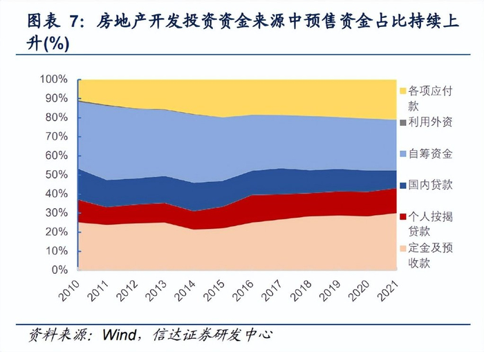 当前全国房地产市场正处在一轮大调整周期底部,银行贷款和债务发行渠道受限,房企 现金流紧张。自 2020 年末“三道红线”出台、监管政策收紧,叠加疫情冲击下需求回落,原 本追求高杠杆、高周转经营模式的房企的现金流受到了较大考验,许多房企经历商业票据、 银行贷款和债券违约等负面事件而“暴雷”,目前仍在加速出清阶段。与其他国家预售制度 中资金受到较多限制不同,国内预售资金用途并不明确。政策层面预收账款与其他债务明显 有别,预收账款并不在“三道红线”统计范围内。2014 年以后,预售资金(定金+个人按揭) 在地产开发投资中的占比持续上升,2021 年末超过 40%,其中有 13.12%来自个人按揭贷 款,更有近 30%来自定金及预收款。现金流状况紧张的情况下,预售资金成为房企投资的重 要资金来源。