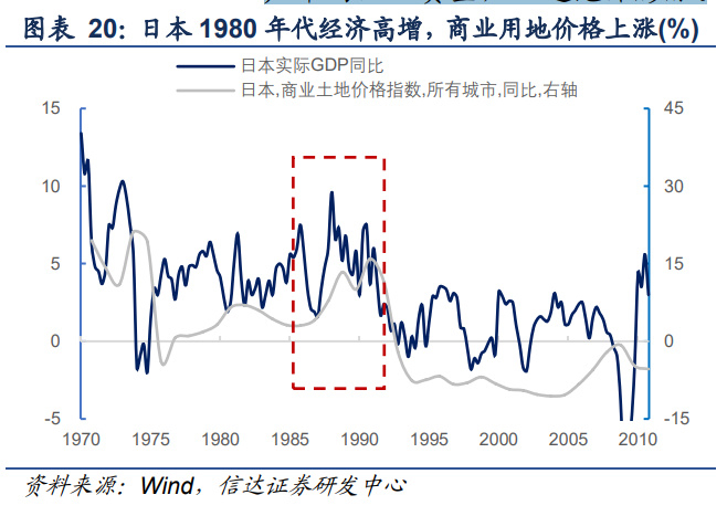 第三,平成景气叠加国际化发展,日本商业用地大幅涨价。受到宽松政策环境影响, 1986 年开始日本经济强劲增长。1988 年实际 GDP 增速达到 6%,是此段“平成景气”时 期的最高值。叠加这一时期的金融自由化和国际化,日本公示地价、尤其是商业用地价格从 1986 年开始出现明显上涨,1987 年日本商业土地价格指数上涨 7.8%,1986-1988 年累计 上涨幅度达到 25%。第四,大量信贷资金向房地产行业集中。随着日本金融自由化加速, 利率市场化导致银行息差收窄,收益承压的银行开始以不动产抵押的形式向中小企业贷款, 1986-1990 年日本本土银行房地产贷款总额增速始终高于贷款总额增速。同时,原本用于支 持个人住房贷款需求的住房金融专业公司开始向非个人客群提供房屋贷款支持,持续向房地 产市场注入资金,加速泡沫膨胀。
