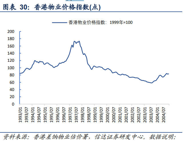 香港地产收入占 GDP 比重较高,楼市下跌对经济造成较大冲击。房地产是香港重要的 经济支柱,而当时借贷炒房地产已成为风气。1997 年中香港银行体系内所有货币之存款大 约 2.7 万亿,贷款大约 4.1 万亿,超借约 1.4 万亿,楼市维持较高热度。1998 年楼市剧跌, 10 月物业价格指数相比 1997 年 10 月的高位下跌 45%。1998 年 6 月底,开发商贷款占银 行总贷款的 20%,个人按揭贷款占银行总贷款的 25%,银行体系有超四成的贷款与楼市有 关。楼市的跌势一直持续到 2003 年,香港经济下行,房地产价格急速回落,社会财富大量 萎缩。