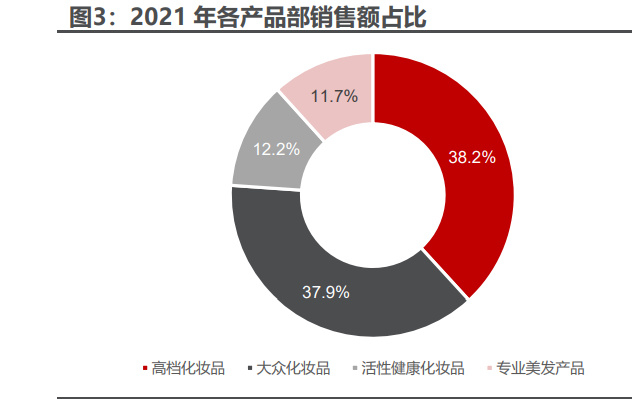 高档化妆品部:主要销售渠道是在百货商店及化妆品店,旗下主要包括兰蔻、 乔治阿玛尼、圣罗兰美妆、碧欧泉、赫莲娜等 17 个高端品牌。随着全球化妆品市 场高端化的推进,欧莱雅高档化妆品部门增长迅速,2021 年实现销售额 123.3 亿 欧元,同比增长 21.0%,超越大众化妆品部,2015-2021 年占整体销售额的比例 从 29.8%增长到 38.2%,对应 CAGR 为 4.2%,增幅亮眼。 大众化妆品部:主要包含 8 个中高端、中低端品牌,其核心品牌为巴黎欧莱 雅、卡尼尔、美宝莲以及 NYX。2021 年,大众化妆品部实现销售额 122.3 亿欧 元,同比增长 4.6%,占整体销售额的比例为 37.9%,仅次于高档化妆品部。 活性健康化妆品部:是健康美妆市场翘楚,主打功能性护肤品,部门内包含理 肤泉、薇姿、修丽可等 5 个品牌。2021 年,活性健康化妆品部实现销售额 39.4 亿 欧元,同比增长 30.3%,在四个产品部中其销售额增速最快。截至 2020 年,活性 健康化妆品部已与全球 180,000 名皮肤科专家合作,旗下产品理肤泉是全球皮肤 科医生建议使用的头号品牌。 专业美发产品部:主要为世界各地的沙龙提供产品,包括巴黎欧莱雅沙龙专属、 巴黎卡诗等 6 个品牌。2021 年,专业美发产品部实现销售额 37.8 亿欧元,同比 增长 21.6%。目前,专业美发产品部已与全球 150 万名发型师合作,拥有 250 间 培训中心,遍布世界各地。