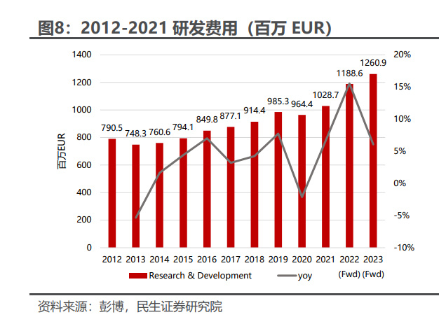 持续加大研发预算投入。公司研发费用呈现稳定上升态势,从 2012 年的 7.9 亿欧元提升至 2021 年的 10.3 亿欧元,与同业相比,处于行业较高水平,21 年公 司研发费用率为 3.19%,超过同期雅诗兰黛的 1.50%。