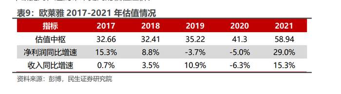 复盘欧莱雅最近五年的估值,我们发现,欧莱雅集团最近五年的估值中枢约在 30-60X 区间内,最近两年的估值中枢则更是在 40-60X 内,过去五年公司营收的 复合增速为 5.5%,净利润的复合增速为 6.4%,其中 2020 年与 2021 年,公司的收入同比增速分别为-6.3%/15.3%,利润同比增速分别为-5.0%/29.0%。通过对欧 莱雅集团的发展历程进行深度复盘,我们发现,目前,海外相对成熟的化妆品行企 业拥有相对较高的高估值溢价主要源自:1)具备品牌矩阵持续扩张能力,例如欧 莱雅集团在百年发展的历史长河中,持续收并购其他化妆品品牌,补全集团产品矩 阵版图,满足不同消费者对美妆护肤类产品的多样化需求,并依托于集团自身拥有 的强大品牌管理及赋能能力,助力旗下品牌实现长远稳健发展,同时不断为公司贡 献新的边际收益;2)公司业绩的确定性、稳定性较高,随着业务版图的不断扩大, 新品牌的持续成熟,驱动公司业绩实现中长期稳定增长,欧莱雅集团的业绩稳定性 不断提高,进而带来更高的估值溢价。