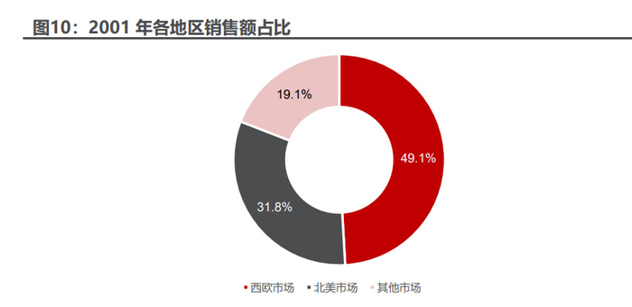 在全球市场,欧莱雅的销售渠道至今主要经历了 4 次变革。 (1)法国市场起家,逐步拓展至周边欧洲国家。在初创起步期,公司的产品 主要销往法国本土及意大利、奥地利、荷兰等周边欧洲国家,并在 1954 年成功进 入遥远的美国市场。欧莱雅的产品主要销往美发沙龙、香水店、药店等渠道。 (2)本土渠道差异化发展,同步推进海外渠道拓展。公司进入初步扩张期后, 在时任 CEO 达勒的带领下,公司开始本土渠道差异化发展,根据不同渠道的市场 定位匹配销售不同品牌:针对大众定位品牌 Dop,公司往往将其投放在超市等偏 大众化渠道进行销售;针对高端产品,公司往往冠以欧莱雅品牌,主要投放在百货、 高端香水店、发廊等渠道进行销售。在产品的持续迭代升级及各渠道快速发展的驱 动下,欧莱雅在法国头发护理产品市场表现亮眼,到 70 年代,在法国市场,欧莱 雅占据染发剂市场约 75%的份额,还占据了超 50%的发胶市场和约 50%的香波 市场。欧莱雅的海外市场则主要以西欧市场为主,到 60 年代,在德国市场,欧莱 雅占据发胶市场约 7%的份额,占据香波市场约 3%的份额。 (3)加快扩张步伐,进军新兴市场。90 年代初,欧莱雅开始进军中东和亚洲 市场,并在 1997 年正式进入中国。2001 年,西欧市场销售额占总销售额的比例 为 49.1%,北美市场占比为 31.8%,新兴市场(亚洲、拉丁美洲、中东等市场) 占比已达近 20%。