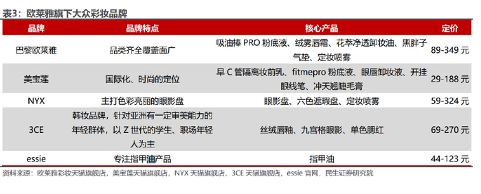 收并购扩充品牌矩阵,实现快速的产品线覆盖。复盘欧莱雅收购品牌后的战略 举措,我们发现,欧莱雅在进行外部品牌收购时非常注重品牌之间的优势互补,而 非简单的品牌叠加:通过深度详尽考察收购标的,欧莱雅会遵循现有品牌矩阵对目 标发展领域进行补强,进而实现品牌间的优势互补,增强协同效应,例如,(1) 2018 年 4 月,欧莱雅收购韩国美妆品牌 3CE,当时的欧莱雅虽然在高端彩妆市场 成绩亮眼,但在大众彩妆领域仅靠当时旗下的美宝莲品牌很难形成较强的优势,而 3CE 作为一个跟随韩国互联网发展而生长起来的社交电商品牌,其天然的社交电 商属性能够帮助欧莱雅集团弥补线下渠道下沉的短板,在大众平价市场上快速形 成自己的竞争优势。欧莱雅收购 3CE 后,2018 年,3CE 在中国天猫旗舰店开业 48 天积累粉丝 87 万,售出细管唇釉 10 万件,创下美妆品牌涨粉记录,彰显了品 牌较强的大众消费者基础,在丰富旗下彩妆品牌矩阵的同时,助力集团进一步深耕 大众美妆领域。(2)此外,香水业务近年来也成为欧莱雅集团全球增长业务的核 心,除传统拉夫劳伦、阿玛尼、YSL 等奢侈品牌香水线外,欧莱雅近年来也发力香 水业务的收购,2016 年公司收购法国高端小众香水欧珑、2020 年收购娇诗韵旗 下香水品牌 Mugler、Azzaro,收购品牌定位都各不相同。欧珑作为第一个只专注 制造古龙水的法国香水品牌,定位高端小众人群,娇诗韵旗下的香水品牌则主要是 定位中高档人群。通过香水业务收购,欧莱雅也逐步形成覆盖经典奢品、高档小众、 中高档等各类型的产品线。