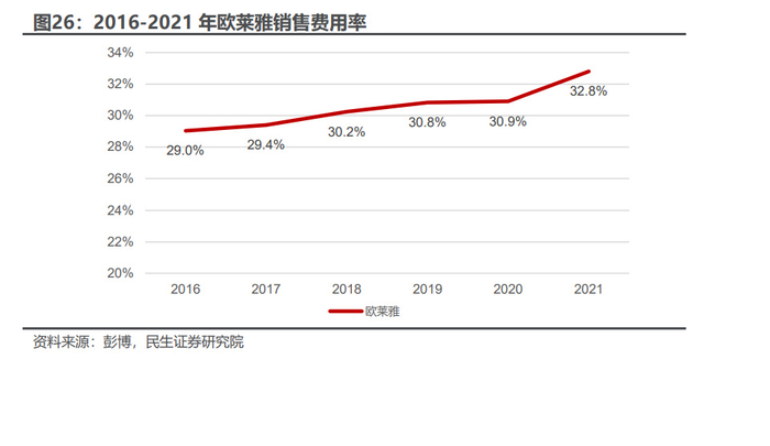 销售费用投放效率高,销售费用率~33%。2016-2021 年,欧莱雅销售费用 从 75.0 亿欧元增长至 105.9 亿欧元,对应 CAGR 为 7.1%;销售费用率从 29.0%增长至 32.8%,增幅 3.8pct。与国内龙头化妆品公司珀莱雅(2021 年销售费用率 42.98%)、华熙生物(2021 年销售费用率 49.23%)等相比,欧莱雅集团的销售 费用率整体偏低,其中主要原因在于:一方面,欧莱雅集团的销售费用投放效率高, 基于 DTC 模式,欧莱雅通过一手的消费者洞察提升了转化率和商品流通效率,节 约了传统经销的渠道费用,优化了货盘结构;另一方面,欧莱雅集团已经实现了网 点共享。以收购小护士为例,在收购小护士后,小护士原有的生产基地、销售网络 和管理团队完全并入欧莱雅集团,为欧莱雅旗下其他品牌进军中国二三线市场打 下基础。