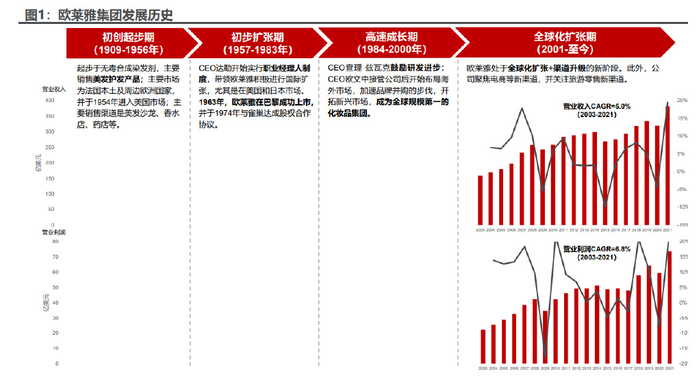 (1)初创起步期(1909-1956 年):1907 年,年仅 28 岁的化学家欧仁·舒 莱尔发明出一种无毒的合成染发剂,将其命名为欧莱雅(L’Oreal)。1909 年,欧 仁·舒莱尔创立欧莱雅公司,并陆续推出 Imedia 染色溶剂、Dop 大众洗发水、太 阳琥珀防晒油、Oreal 冷烫发产品等产品,主要销往法国本土及意大利、奥地利、 荷兰等周边欧洲国家,并在 1954 年成功进入美国市场。产品销售渠道方面,在早 期,欧莱雅的产品主要销往美发沙龙、香水店、药店等渠道。