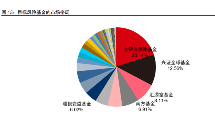 目标风险基金的市场集中度更高,CR5 占比约 54%。截至 2022Q3,共有 45 家公募 机构管理目标风险基金,管理规模合计 767.6 亿。其中,交银施罗德基金的管理规模居前, 达 154.6 亿,占比 20.1%;其次是兴证全球基金、汇添富基金、南方基金和浦银安盛基金, 占比分别为 12.6%、8.1%、6.9%、6%。前三大机构管理规模合计 41%,前五大机构管理 规模合计 54%。
