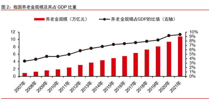 我国养老金规模占 GDP 比重较低,约 9.4%。截至 2021 年底,我国养老金规模合计 10.8 万亿,占 GDP 比重约 9.4%。尽管近年来,我国养老金规模占 GDP 比重逐年上升, 从 2007 年底的 3.5%提升至 2021 年底的 9.4%,但仍低于主要 OECD 国家的平均水平1。