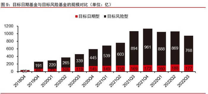 2018 年以来,公募养老目标基金数量快速增长。2018 年末,市场中已成立的养老目 标基金仅有 12 只,包括 8 只目标日期基金和 4 只目标风险基金。此后,养老目标基金数 量快速增长,截至 2022 年 11 月 25 日,已成立的养老目标基金合计 195 只,包括 86 只 目标日期基金以及 109 只目标风险基金。 养老目标基金规模稳步提升,从 2018Q4 的 56 亿增长到 2022Q3 的 945 亿。截至 2022Q3,养老目标基金管理规模合计 945 亿,其中目标日期基金规模合计 177.4 亿,占 比 19%;目标风险基金规模合计 767.6 亿,占比 81%。