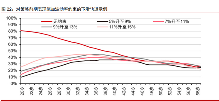 目标风险基金的战略配置核心是组合风险控制,通常包括“无模型”与“有模型”两种方 法。 “无模型”方法的代表是 Vanguard 目标风险基金,使用不同的固定比例的股债配置策 略来满足不同风险偏好类型的投资者需求。具体而言,Vanguard 目标风险基金包括收入型、保守成长型、稳健成长型与成长型四类,对应的基准股债配置比例分别为 20/80、40/60、 60/40、80/20。 “有模型”方法通常使用带风险约束的资产配置模型求解资产配置比例。例如在均值— 方差模型/风险平价模型中加入波动率限制、VaR 限制、E-shortfall 限制等:(1)波动率限 制:要求资产组合的年化波动率不超过一定的阈值,例如目标波动率为 8%的目标风险模 型;(2)VaR 限制:控制资产组合损失超过某一阈值的概率不高于某一定值(1%,5%, 10%),例如要求组合每月亏损大于 1%的概率不超过 5%;(3)E-shortfall 限制:控制资 产在某一置信水平下的最大期望损失,例如要求组合在 90%的置信水平下期望损失在-2% 以内,也就是说在极端 10%行情下的平均损失要在-2%以内。