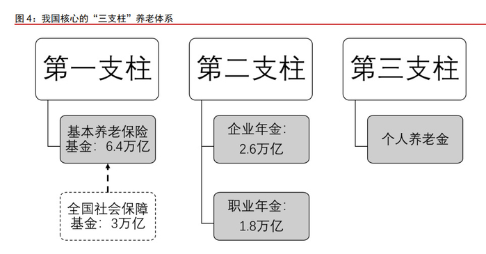 截至 2021 年底,我国养老金规模合计 10.8 万亿,养老体系仍以第一支柱、第二支柱 为主,第三支柱尚处于起步发展阶段。