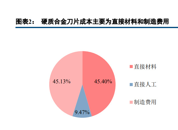 上游原材料中,硬质合金刀具主要原料为碳化钨,直接材料成本中占比超 50%。以华锐精密硬质合金数控 刀片成本构成为例,生产成本可分为直接材料、直接人工和制造费用,三者分别占比 45.1%、9.5%、45.4%。其 中直接材料分为原材料(碳化钨粉、钴粉、钽铌固溶体)与辅材料。原材料占比高达 69.7%,其中碳化钨粉、钴 粉、钽铌固溶体、其他金属粉末占比分别为 52.72%、7.39%、5.97%、3.58%。其余辅材料占比为 30.34%,其中 涂层辅料备件、配套刀杆刀盘、磨削材料占比最高,分别为 4.98%、4.42%、4.03%。