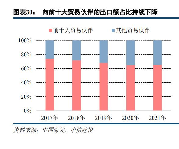 从出口结构来看,CR10 持续下降,目的地持续多元化。向前十大贸易伙伴出口额占全部出口额的占比从 2017 年的 73.78%降至 2021 年的 65.00%,出口目的地数量从 158 个增至 163 个,刀片出口目的地持续多元化。 从发展潜力来看,发展中国家是未来主要的目标市场。2021 年我国刀片出口前十大贸易伙伴中,向发达国 家和地区出口额为 7.36 亿元,同比增长 23.20%;向发展中国家出口额为 4.30 亿元,同比增长 73.87%。前十大 贸易伙伴中向发展中国家出口的占比从 2017 年的 21.55%提升至 2021 年的 36.88%,发展中国家市场开拓进展 良好,营收增长潜力较大。