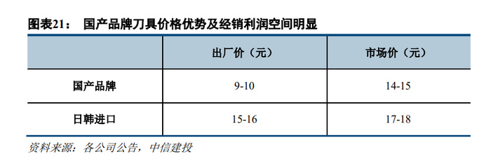 除性能接近日韩以外,国产刀具有更优的价格、经销利润空间与更快的产品更新速度。2022 年以来制造业 较为低迷,企业降本意愿高,偏好性价比更高的国产刀具。另外,下游经销商也偏好售卖利润更高的国产产品, 性能相同的情况下,某进口刀具出厂均价约 15-16 元,经销商可加价至 17-18 元,而国产刀具出厂价在 9-10 元, 经销商可加价至 14-15 元,加价利润空间更大。产品更新速度方面,由于进口刀具企业面向全球,精力较为分 散,而国产刀具企业目前以服务国内市场为主,有更多的精力服务国内客户,也拥有更快的产品更新速度。