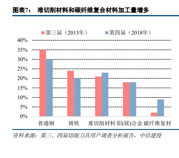 不同材料刀具适用于不同材料工件,普通钢和铸铁加工量下滑,难切削材料和碳纤维复合材料加工量增多。 目前被加工工件材料主要有普通钢、铸铁、不锈钢/耐热钢/钛合金等难切削材料、铝(镁)合金以及碳纤维复合材 料等。通过近两届切削刀具用户调查分析报告的对比数据可知,普通钢及铸铁的加工量呈下滑趋势,两者占比 总体下降近 10%。难切削材料的加工量上升,占比达 23%,反映出被加工材料的复杂化。铝(镁)合金则基本持 平,占比为 18%。碳纤维复合材料加工量呈现倍增的形式,由 2%上升至 9%,主要得益于近年来航空航天、船 舶及核工业等行业的突飞猛进,传统材料难以满足其性能要求,碳纤维复合材料得到大量的应用。难切削材料 增多带动陶瓷和超硬刀具使用量增加。通过近三届的对比数据来看,硬质合金刀具使用量始终维持在 50%以上, 而高速钢刀具使用量下降明显。陶瓷刀具由于其硬度大大高于前两种刀具,且切削速度快、寿命长,主要用于 加工硬质合金刀具不能加工的高硬材料,占比提升至 8%。立方氮化硼具有很高的硬度和耐磨性,其硬度仅次于 金刚石,此外还有优良的化学稳定性及高温下的热稳定性;金刚石刀具具有硬度高、抗压强度高、导热性及耐 磨性好等特性,两者均适合切削高硬度及难加工材料,占比分别提升至 8%和 6%。