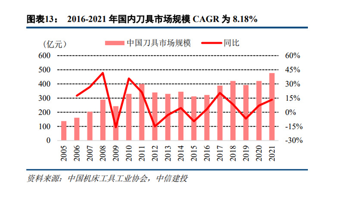 中国是全球第二大刀具市场,2021 年市场规模为 477 亿元。我国刀具市场规模与我国制造业的发展水平和 结构调整密不可分。受国内投资增速放缓和需求结构调整影响,2011-2016 年刀具市场规模有所下滑。随着“十 三五”规划的落地,国内供给侧结构性改革的不断深化,我国制造业朝着自动化和智能化的方向快速转型升级, 推动了刀具消费市场恢复性增长,2016-2020 年刀具市场规模从 322 亿元提升至 421 亿元。2019 年受中美贸易 摩擦加剧、汽车等下游行业下行的影响,市场规模有所下降。2021 年我国刀具市场延续疫情后的复苏态势,同 比增长 13.3%至 477 亿元,近五年 CAGR 为 8.18%,远高于全球(约 2%)。