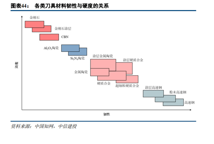 金属陶瓷刀具的材料性能接近硬质合金刀具,相较陶瓷刀具所适用的加工场景更为广泛。从各类刀具材料 韧性与硬度的关系可以看出,金属陶瓷刀具的材料性能介于陶瓷刀具和硬质合金刀具之间,且性能与硬质合金 刀具类似,具有良好的综合性能。从各类切削刀具材料所适用的工具类型来看,金属陶瓷主要应用于车削及孔 加工,而陶瓷刀具主要用于车削和铣削加工,金属陶瓷刀具的应用场景更为广泛。