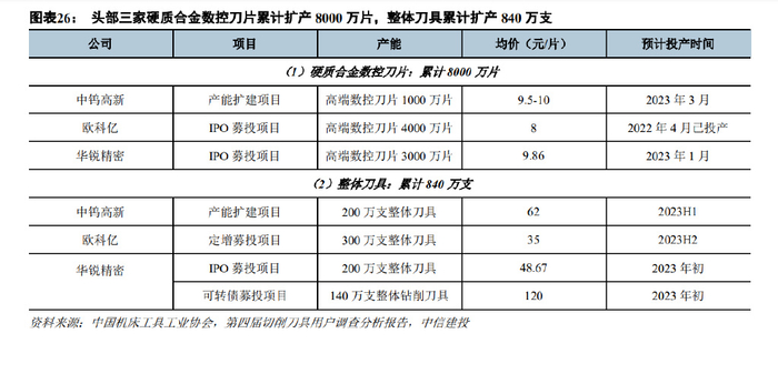 预计头部企业新增产能将被充分消化。从中钨高新、欧科亿、华锐精密三家的扩产计划来看,硬质合金数 控刀片累计扩产 8000 万片,整体刀具累计扩产 840 万支,考虑到产能爬坡,预计 2024-2025 年才能完全释放, 远小于测算的 2022-2025 年国产新增需求,预计随着国产替代的稳步推进,扩产产能将被充分消化。