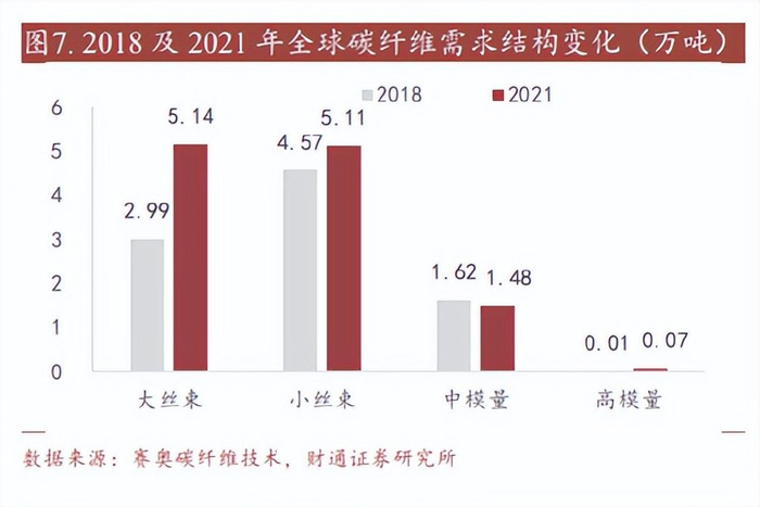 从产品结构看,大丝束占比明显提升。根据赛奥碳纤维技术,2021 年大丝束产 品份额与小丝束相当,大约均占比 43%,相比之下,2018 年占比仅为 32%,大 丝束占比的不断提升,反映的是 2021 年民用航空市场的疲软以及风电市场的持 续增长。而对于碳纤维工业应用而言,成本尤为重要,大丝束是降低成本的主要 路径,不仅可以通过低成本扩大工业应用领域,也会不断吞噬成本敏感的小丝束 传统市场。