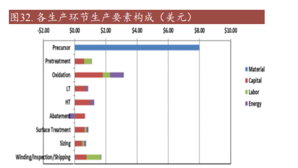 从生产要素看,原材料依然是最主要成本,设备、人力成本其次。碳纤维的制 备成本主要包括原丝生产成本、装备设施折旧、劳动力、能耗等。根据 Sandia National Laboratories 数据,以 50K 碳纤维为例,其中 45%成本来自于原丝生产, 37%的成本在于装备设施折旧费用。除上述成本以外,还有环境安全、质量安全、 产品质量稳定性等影响碳纤维价格的多种因素。 在后续各主要生产环节中,氧化环节本占比最高,占总成本比重 18%,也是对固 定资产、能耗要求最高的工艺环节,占固定资产投资的 22.6%。此外,氧化也是 决定生产速度和产出效率的关键步骤。氧化炉是耗时最长的生产环节,根据蓝鲸 腾飞,如果生产碳纤维全过程需要 88min, 其中预氧化时间大约需 80min,约占 总生产时间的 90%左右,因此如何在保证质量的前提下,缩短预氧化时间,也是 提升产量和降低成本的重要方式之一。