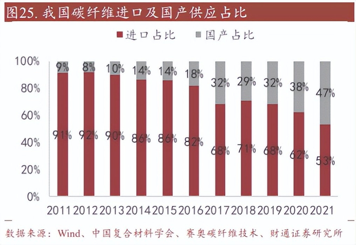 3.2 国内:碳纤维进口总量仍然高于国产量,大丝束开启产业化布局