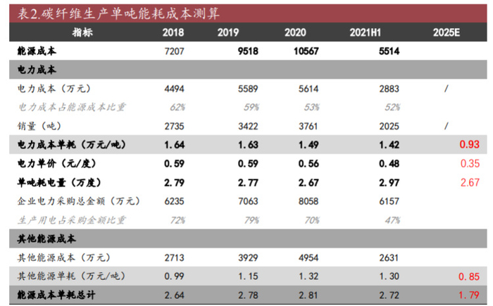 4) 能源消耗:生产单吨碳纤维的电力成本=单吨耗电量*电力单价。1)单吨耗 电量:从历史数据看,碳纤维生产单吨耗电量约为 2.67-2.97 万度,这里我们假设随着规模效应显现,未来单吨耗电量贴近下限,为 2.67 万度/吨。2)电 力单价:根据北极星智能电网在线、全国能源信息平台数据,2021 年 Z 公司 所在江苏省大工业用电价格(220 千伏)约为 0.5318 元/度,而青海省(220 千伏)约为 0.3382 元/度,目前公司 1.45 万吨产能中有 1.1 万吨在西宁地区, 随着西宁二期逐渐投产,单吨电力成本将逐渐降低,假设未来电力成本贴近 西宁地区度电成本,假设为 0.35元/度。此外,光威复材也在内蒙古进行扩产, 因此未来碳纤维生产企业在电价低成本地区扩产或是一种趋势。3)其他能 源成本:生产过程高温加热环节需要大量燃料动力,其他能源主要包括外购 蒸汽。随着未来碳纤维生产企业在电价、煤价成本较低的地区扩产或是一种 趋势,因此假设蒸汽成本与电力同样幅度下降。