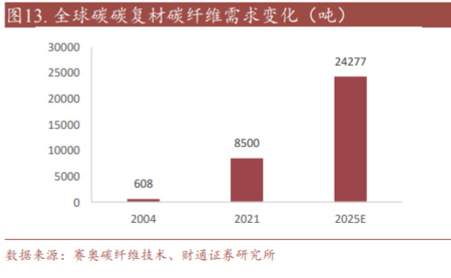 碳/碳复材是以碳纤维为增强相的碳基复合材料,是目前极少数可以在 2000 ℃以 上保持较高力学性能的材料,主要应用于三大领域:刹车盘、航天部件、热场部 件 。1) 刹 车盘市 场 :目前国际企业 主要 包括法 国 Messier-Bugatti、美国 Honeywell、英国 Dunlop 等。国内飞机刹车盘企业主要有北摩高科、中航飞机股 份有限公司西安制动分公司、博云新材、西安超码等,目前市场较平稳发展;2) 航天部件:目前碳碳复材以其优异性能成为大型固体火箭喉衬、发动机的喷管、 扩散段、端头帽等的首选材料。3)热场部件:主要用于单晶硅炉内,包括碳毡 功能材料和坩埚、保温桶、护盘等结构材料,正在快速形成晶硅制造热场系统中 对石墨材料部件的进口替代与升级换代。国际企业主要包括 SGL、日本东海碳素 公司等,国内企业主要包括金博股份、西安超码等。由于光伏及半导体行业的技 术迭代,硅片也在向高纯度、大尺寸发展,因此热场系统应用中,碳碳复材产品 向高纯度、大尺寸的方向发展也是必然趋势。 根据赛奥碳纤维技术数据,2021 年我国热场材料碳纤维需求量为 0.7 万吨,占全 球碳碳复材碳纤维需求量(0.85 万吨)的 82.3%。2021 年全球碳碳复材碳纤维需 求量 0.85 万吨,同比 2020 年增长 70%。根据赛奥碳纤维技术预测,预计 2025 年 全球碳碳复材碳纤维需求量将达到 2.4 万吨,复合增长率为 30%。
