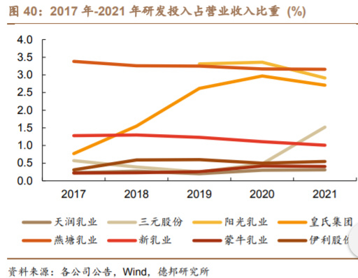 区域乳企研发投入高,储备特色产品等待机会。近五年区域乳企的研发投入 总额逐年攀升,研发投入占营业收入比重普遍高于龙头蒙牛和伊利,其中阳光乳 业、皇氏集团、燕塘乳业近三年研发投入占收入比高于 1%。因区域乳企在研发方 面的大量投入,其新品贡献成效显著。新乳业在 2021 年推出了一系列新品,整 体销售收入贡献超过 10%,多款零糖产品增长超过 150%。燕塘乳业 2021 年相 继推出“鲜致牧场”ESL 牛奶、无蔗糖健菌多、A2β-酪蛋白鲜牛奶等多款新品,全 年液体乳类营收同比上涨 28.05%,乳酸菌乳饮料类同比上涨 20.40%。天润乳业 2021 年度奶啤产能超过 100 吨/天,据新京报数据显示,奶啤约占公司乳制品销 售收入的 10%,毛利率远高于畜牧业、常温乳制品、低温乳制品等品类。