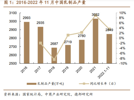 千亿级乳制品行业,长期成长仍有空间。据欧睿数据统计,中国 2022 年 乳制品行业市场规模已接近 6600 亿元。国家统计局数据显示,2022 年 1 至 11 月中国乳制品产量为 2849 万吨,同比增长 3.6%,2021 年全年中国乳制 品产量为 3032 万吨,同比增长 9.0%。同时,国家统计局数据显示,中国乳 制品行业 2000 年至 2019 年产销率基本都在 100%上下浮动,说明我国消费 者向来对乳制品需求充分。中国奶业协会统计数据显示,2016 年至 2020 年 中国乳制品加工销售收入缓慢平稳增长,CAGR 为 4.6%,2021 年 1-11 月销 售收入达 4288 亿元,超过 2020 年全年。预计乳制品行业长期产量与销量仍 将缓慢提升。