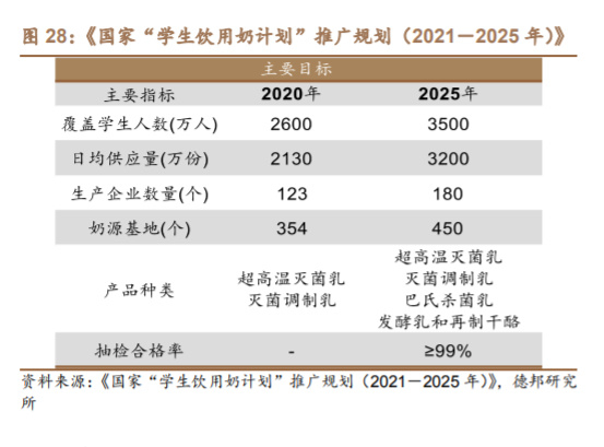 学生奶计划需求庞大且稳定,具有区位优势的地方乳企更具优势。为改善我 国中小学生的营养状况,以利青少年健康成长,2000 年我国原农业部、国家发展 计划委员会等七部门联合启动实施国家“学生饮用奶计划”。学生奶计划在政府支持 下直接向学校提供饮用奶,供需关系稳定且长期。对于各乳企而言,学生奶业务 虽盈利能力不及传统渠道,但没有费用投放且需求稳定,可以长期贡献收入体量。 另外,从小培养孩子的饮奶习惯也有助于形成口味粘性与品牌认知,区域乳企作 为地方性企业布局学生奶市场更能逆势突围。 学生奶计划扩大供应对象和乳品品类,加速品牌渗透。2020 年 12 月《国家 “学生饮用奶计划”推广规划(2021-2025 年)》正式发布,覆盖产品种类增加 巴氏杀菌乳与再制干酪。2022 年 5 月《国家“学生饮用奶计划”推广管理办法》 (修订版)正式发布,与 2017 年版本相比,修订后的管理办法规定供应对象从限定 中小学生扩大至所有学生,在纯牛奶和调制乳基础上增加巴氏杀菌乳和再制干酪 等,学生奶供应对象和品类的扩容丰富了学生选择,同时巴氏杀菌乳对冷链运输 与存储也提出了更高要求,区域乳企依靠其固有供应链优势与密集网点数量,在 生产与调度方面更具优势,更好地配合学生奶计划推进,提供了更大市场空间。