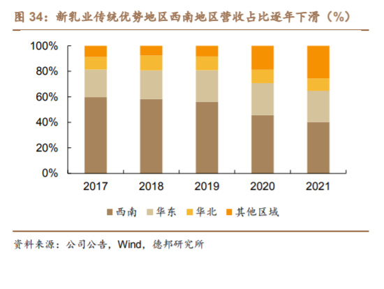 投资并购发展市场,区域乳企全国化进程加速。区域乳企由于奶源和冷链的 限制,虽然在低温奶市场中具备优势,但同时也比较受限。一些区域乳企业为了 公司进一步发展,往往可以通过投资并购等手段扩大企业规模,拓展产品矩阵, 开拓全国市场,从而促进公司自身进一步的发展。区域乳企光明乳业、新乳业等 近年来都通过投资并购等手段完善公司的奶源和产能布局,促进公司业绩的进一 步增长。 内生增长与外延并购并举,企业提质提速发展。新乳业自 2000 年以来共进 行三轮并购,通过并购多家地方乳企拓展业务版图,进驻澳亚牧场等锁定长期优 质奶源供应,同时不断丰富营养食品生态圈,实现外延式并购扩张和内生式提质 增效的共同增长。从新乳业营业收入情况来看,其传统优势地区西南的营收占比 从 2017 年的 59.7%下降至 2021 年的 40.3%,西北地区营收占比在 2021 年达到 16.0%,全国化进展顺利。光明乳业在资产并购方面较为谨慎,2010 年通过收购 新西兰新莱特 51%股权拓展奶粉业务,2018 年收购益民一厂 100%股权拓展业务 至冷饮冰淇淋领域,2019 年 12 月成功竞拍江苏辉山乳业及江苏辉山牧业相关资 产,2021 年 10 月以 6.12 亿的价格成功收购青海小西牛 60%的股权,通过收购 其他区域乳企整合巩固奶源基础,进一步优化产能,完善在华北、华东以及西部 地区的奶源和产能布局,有利于公司进一步实现全国化发展。