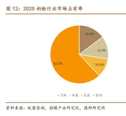 中国奶粉行业CR3市占率持续提升。2020年,中国奶粉行业CR3达到38%, 行业集中度提升趋势明显。2020 年,行业前三的品牌分别是飞鹤、雀巢、达能, 其中飞鹤以 14.8%的市场占有率位居第一位。相较于国外,国内婴幼儿配方奶粉 和成人奶粉起步较晚,研发能力较弱,具有一定的增长空间。