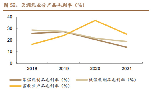 常温乳制品品类近年快速增长,2021 年低温、常温品类势均力敌。天润产品 品类按照官网口径分为奶啤、白奶和酸奶三个板块,其中奶啤仅有常温保存产品, 酸奶仅有低温保存产品,而白奶二者皆有。2021 年常温与低温乳制品营收分别为 11.0 亿元与 9.4 亿元。常温乳制品随天润疆外扩张的脚步,凭借其新疆奶源的特 点与较高性价比,近年来营收迅速攀升。2021 年常温乳制品反超低温乳制品,成为天润营收占比最高的产品品类。