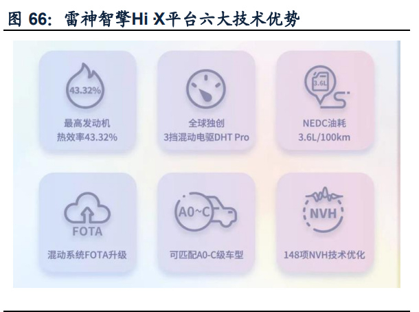 (3)大禹电池技术:以“控+导=通”为技术原理,通过行业内最严苛的高镍电芯测 试验证,为解决三元电池热失控问题提供了全新思路。该技术首搭沙龙首款高性能 机甲战跑——机甲龙,在保证1000℃高温不起火、不爆炸过硬安全性能的基础上, 实现零百加速3.7s,CLTC续航达802km,全球领先的800V/480kW高效补能技术和 关联APA无线充电功能等优异性能,将电动汽车产品性能提至新高。