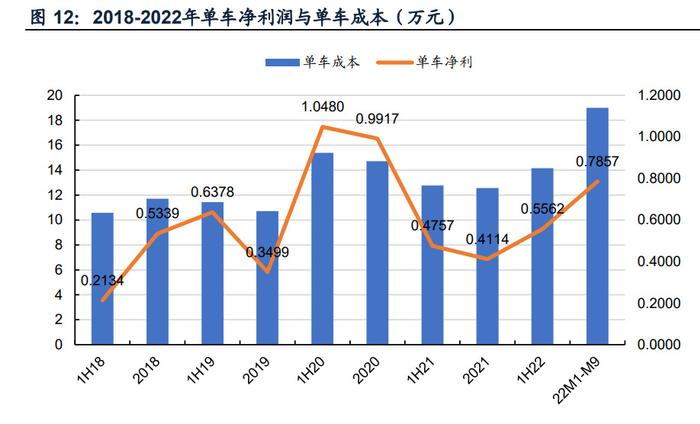 得益于锂矿布局,在电池原材料全线上涨的2021年,比亚迪单车成本不升反降, 同比下降 14.68% , 实现毛利率 17.39% , 高 于 同 期 广 汽 / 长 城 / 长 安 的 4.07%/16.13%/16.64%。1H22比亚迪单车净利润同比增长16.92%至5,562元, 9M22单车净利润同比增长45.60%至7,857元。