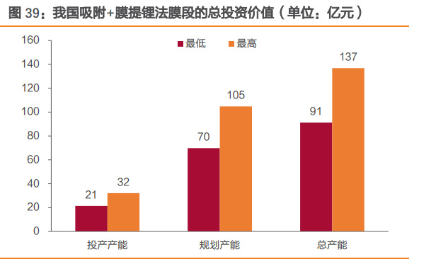 在盐湖提锂工段中,吸附段与膜段价值占比较大。吸附+膜法提取锂资源主要包括吸附段 和膜段等。据此测算,我们预计我国吸附+膜法提锂中吸附段的总投资价值或将达到 46~91 亿元,膜段的总投资价值或将达到 91~137 亿元。总体来看,我国吸附材料和膜材料的需 求量不断扩张,投资价值逐渐显现,吸附+膜法提锂的市场空间广阔。