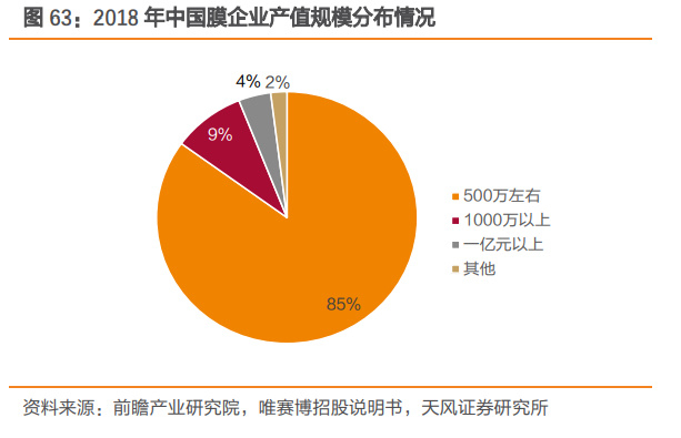 我国膜产品销售中,50%的市场被反渗透膜(RO)与纳滤膜(NF)占据,且膜法提锂工艺 中主要运用反渗透膜与纳滤膜这两类膜,因此本节对竞争格局的讨论围绕这两类膜而展开。 纵观全球企业,国外企业起步较早,现阶段占据较大市场份额。在反渗透膜和纳滤膜市场 上,国外企业起步较早,其利用丰富的行业经验和先进的研发、生产技术,占据了全球大 部分市场空间。典型企业为美国杜邦水处理(原陶氏化学有限公司)、日东电工集团/美国 海德能公司、日本东丽、科氏、苏伊士(原美国通用水处理)等。我国反渗透膜及纳滤膜 市场曾长期依赖进口,被国外企业所垄断。多数国内膜企业规模小、资金少、研发能力弱。 前瞻研究院调研结果显示,截至 2018 年我国膜企业年产值亿元以上的企业仅占 4%左右。