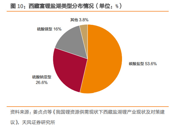 盐湖资源方面,青海和西藏两地盐湖锂资源储量均较为丰富。根据 2010 年亚洲金属网金 属百科统计,我国盐湖卤水锂资源集中分布在青海和西藏,两地盐湖锂资源量占比达 91.58 %。根据钜大锂电网测算可知,我国青海盐湖区氯化锂储量共计约为 2,447 万吨,锂 资源主要分布在西台吉乃尔、察尔汗、大柴旦等五大盐湖;西藏盐湖的氯化锂储量共计约 1,738 万吨,主要分布于扎布耶、龙木错等盐湖区域,绝大部分盐湖为地表卤水。