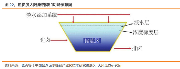 太阳池法利用碳酸锂溶解度呈现负温度效应的特性,通过在盐梯度太阳池中加热高锂成卤 获得碳酸锂。盐梯度太阳池从上到下由 3 层组成。上层为上对流层,主要成分为淡水,其 温度与环境温度接近,对其下盐梯度层起到保护作用;下层为下对流层,主要成分为饱和 盐溶液,具有吸热和储热的功能;中间非对流层的盐浓度随着池深度的增加而不断增加, 利用淡水、卤水折射率的不同,将热能储存于池底卤水中,提高了下对流层的温度。由于 碳酸锂的溶解度随温度升高而降低,而卤水中其他盐类溶解度的变化均与之相反,所以在 下对流层升温后,其他盐类难以析出,而碳酸锂会大量析出,在池底沉淀富集。在冬季, 卤水中锂浓度较高,且由于太阳池出色的储热能力,碳酸锂仍能从卤水中析出,从而能够 实现全年连续生产。