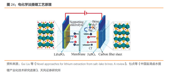 电化学法利用锂电池系统中的锂插层/脱层原理提锂。作为锂捕获材料,工作电极先从卤 水中捕获锂离子,再将其释放到溶液中回收,从而实现锂元素的提取。这种方法可以避免 传统脱锂过程中使用酸洗造成的材料溶损,增强了循环性能,是一种低能耗、高效率的提 锂技术。目前学界已探索出 LiFePO4/FePO4 电极体系,实现了卤水中锂的选择性提取,并 正在将该技术往产业化推广。 使用电化学方法提取锂的过程简单、连续性好,回收过程不用添加其他化学试剂,几乎不 引入杂质,产品的纯度和回收率高。该法要求锂捕获材料具有优良的选择性、高的锂容量 和长期稳定性。在电极上化学反应中需避免副反应,对电解液组成要求较高,系统需要进 一步优化,并在产业化应用中验证适用性。