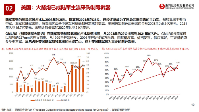 陆军采购的制导武器占比从2003年的25%,提高到2021年的38%,已经逐渐成为了制导武器采购的主力军。制导武器主要由 空军、海军和陆军采购,随着现代战争中陆军对精确制导需求的提高,美国陆军制导武器采购金额2003年为6.3亿美元,2021 年达到15.7亿美元,采购金额最高的2020年达到21亿美元。 GMLRS(制导远程火箭炮)在陆军采购制导武器的占比快速提高,从2003年的29%提高到2021年的72%。GMLRS是美军可 以制导的227mm远程火箭炮。从1999年开始研发,2003年开始被军方采购,因其精度高,价格便宜,供应充足,可装备的弹 头类型丰富,早已占据美国陆军制导武器的半壁江山,成为美国陆军最为重要的制导武器。