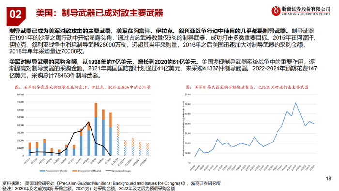制导武器已成为美军对敌攻击的主要武器,美军在阿富汗、伊拉克、叙利亚战争行动中使用的几乎都是制导武器。制导武器 在1991年的沙漠之鹰行动中开始显露头角,通过占总武器数量仅6%的制导武器,成功打击多数重要目标。2015年在阿富汗、 伊拉克、叙利亚战争中消耗制导武器28000万枚,远超其当年采购量,2016年之后美国迅速加大对制导武器的采购金额, 2018年单年采购量近70000枚。 美军对制导武器的采购金额,从1998年的7亿美元,增长到2020的61亿美元。美国发现制导武器系统战争中的重要作用,逐 渐提高对制导武器的采购金额。2021年美国国防部计划通过41亿美元,来采购41337件制导武器。2022-2024年预期花费147 亿美元,采购总计78463件制导武器。
